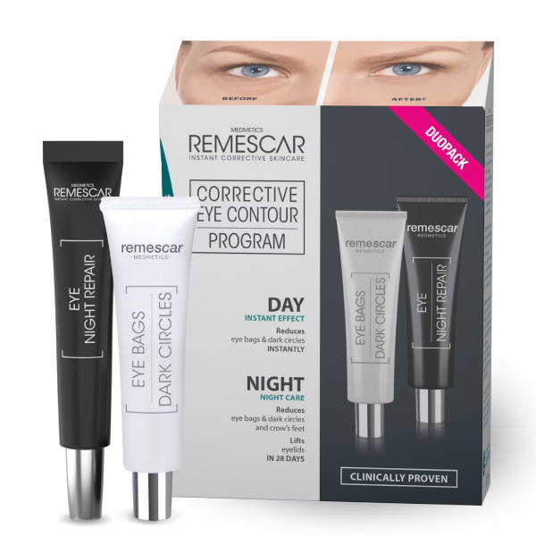 El Programa Corrector Contorno de Ojos de Remescar es un dúo con la rutina ideal para la zona del contorno de ojos. Bolsas y Ojeras de Remescar reduce inmediatamente las bolsas y ojeras con resultados visibles hasta 10 horas. El Reparador Noche de Remescar reduce las bolsas, ojeras y patas de gallo, y eleva los párpados caídos durante la noche.